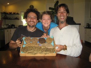 When we arrived John had just picked a huge watermelon from his garden and sliced it up for us – I have never tasted anything so refreshing and delicious! We pretty much devoured the whole watermelon between us, before our other friends arrived and we sat down to a super lunch! John prepared a tasty raw vegetable soup, and Damian made some of the best raw pizza’s I have ever tasted! Therese, owner of Sunbread bought a huge range of dehydrated crackers, wraps and Sunbreads for us to try, along with a sprouted almond hummous – I love raw food feasts!
